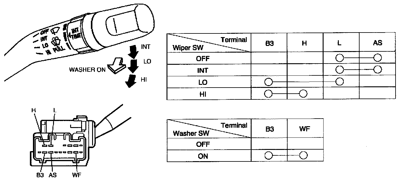 Check for continuity between terminals at each switch position as shown in the figure. If check result is not as specified, replace.
