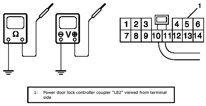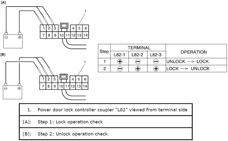 3. Confirm that all doors are unlocked. Connect battery positive (+) and negative (-) terminals to door lock controller coupler terminals, and check door lock and unlock operation as follows.
