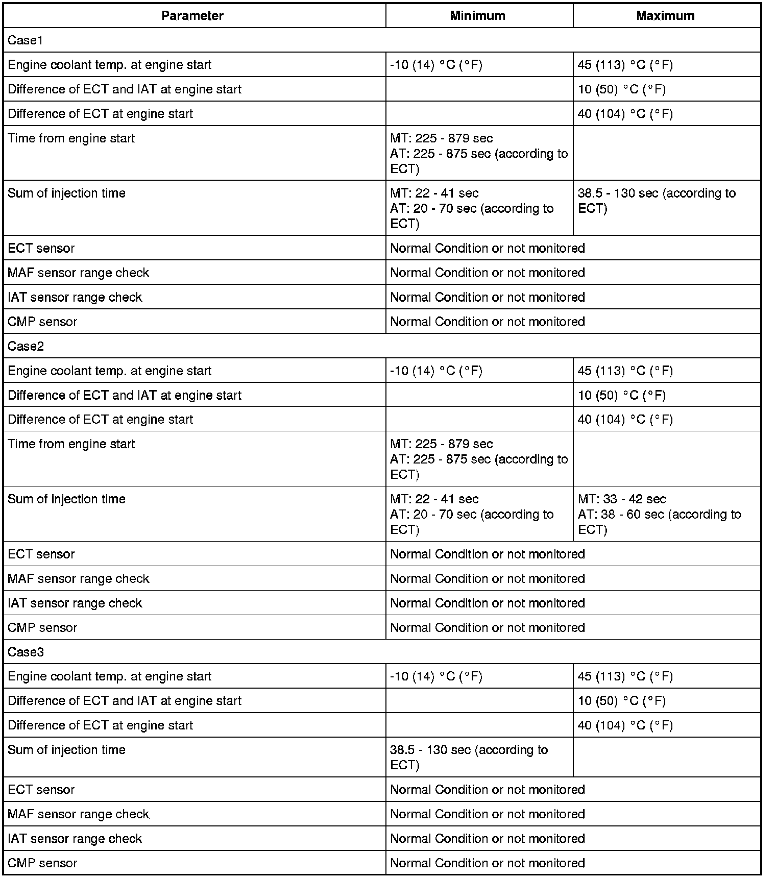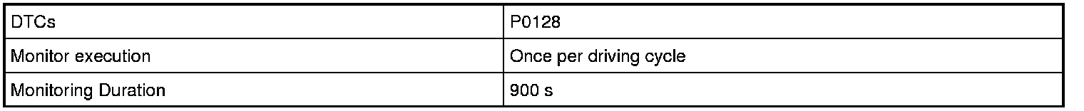 The thermostat is considered malfunctioning if the coolant temperature does not reach the warmed-up temperature at which the thermostat is at the regulating temperature within 11 degrees Celsius, or the highest temperature required to enable other diagnostics, after the specified elapsed time.