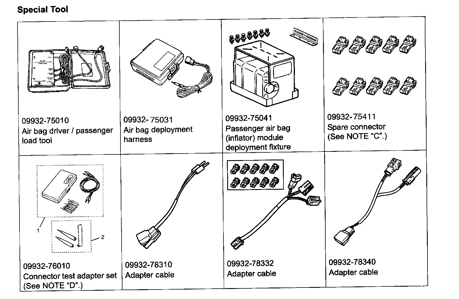 1. Connector test adapter kit (09932 - 75020), 2. Connector test adapter & shorting bar release tool (09932-76020)