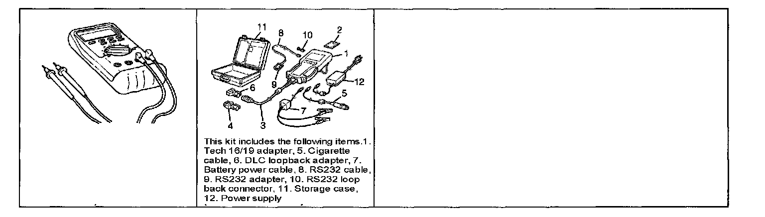 1. Tech 2, 2. PCMCIA card, 3. DLC cable, 4. SAE 16/19 adapter, 5. Cigarette cable, 6. DLC loopback adapter, 7. Battery power cable, 8. RS232 cable, 9. RS232 adapter, 10. RS232 loopback connector, 11. Storage case, 12. Power supply