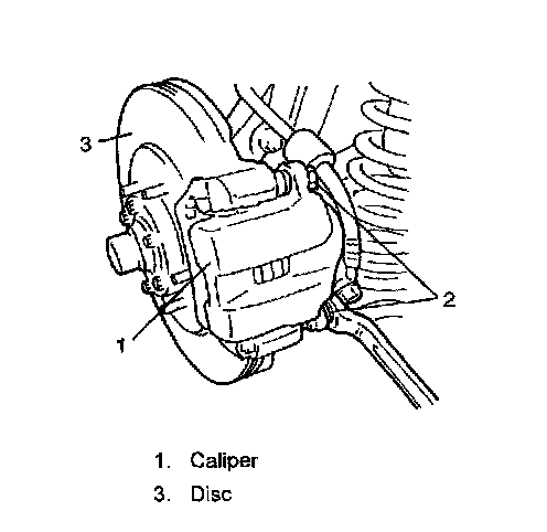 NOTE: Hang removed caliper (1) with a wire hook (2) or the like so as to prevent brake hose from bending and twisting or being pulled. Don't operate brake pedal with pads removed.