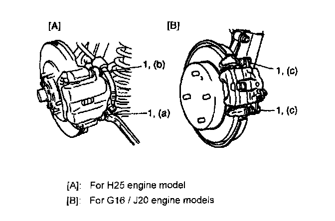 Caliper pin bolt (for H25 engine model) (b): 85 Nm (8.5 kgf-m, 61.5 ft. lbs.)