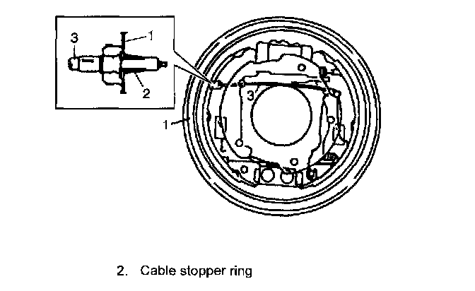 4. Remove cable (3) from brake back plate (1) by squeezing parking brake cable stopper ring (2).