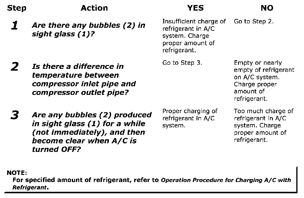 Quick Check of Refrigerant Charge AmountThe following procedure can be used for quickly checking whether the A/C system has a proper charge of refrigerant or not.