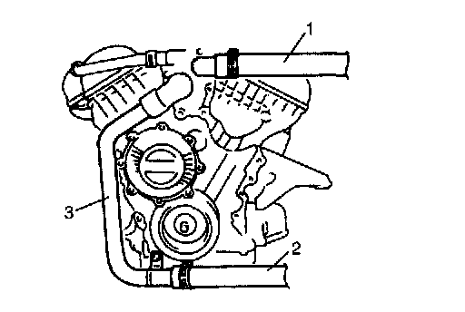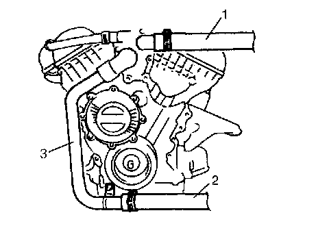 3. Remove radiator inlet hose (1), outlet hose (2) and radiator outlet pipe (3).