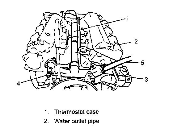 8. Remove water outlet pipe (2) from thermostat case (1).