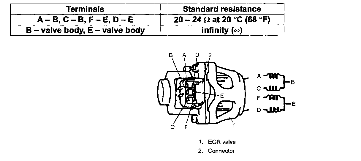 1. Check resistance between the following terminals of EGR valve in each pair. If found faulty, replace EGR valve assembly