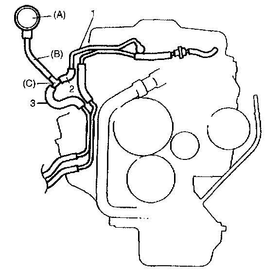 3. Connect special tools and hose (2) between fuel feed hose (3) and fuel feed pipe (1) as shown in figure, and clamp hose securely to ensure no leaks occur during checking.