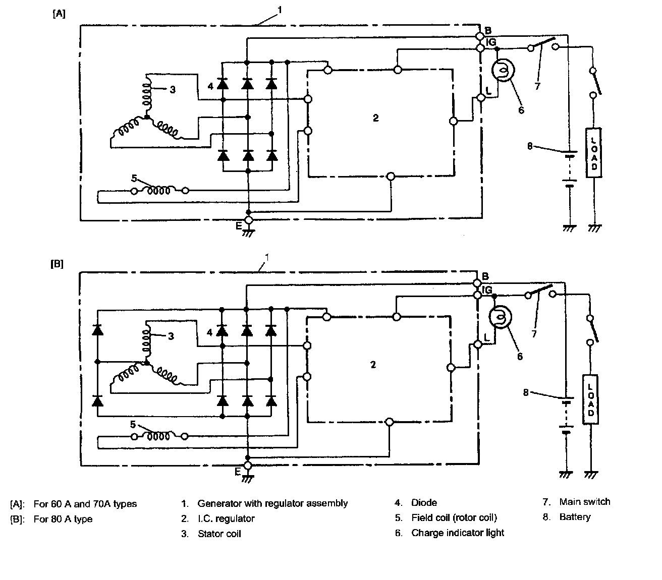 The neutral diodes serve to convert the voltage fluctuation at the neutral point to direct current for increasing the generator output. (70 A and 80 A only)