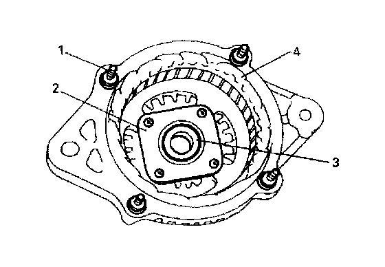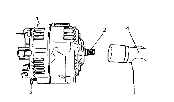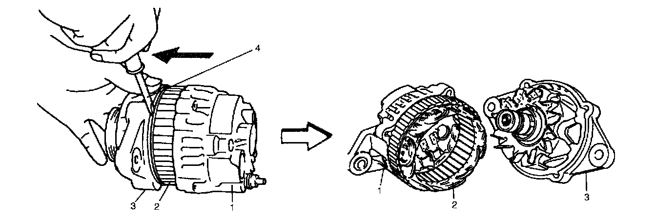 3. With lever (4) inserted between stator core (2) and front housing (3), separate generator into front (3) and rear (1) sides.