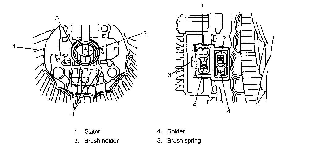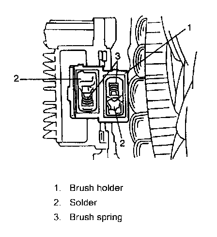 10. To remove brush, remove holder cover from brush holder and then disconnect brush wire from regulator terminal by using soldering iron.