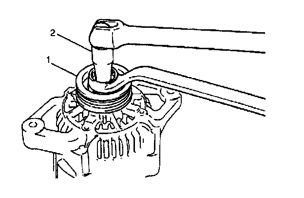 9. Install pulley (1) and tighten pulley nut with holding shaft by using hexagonal box wrench (2) to specified torque.