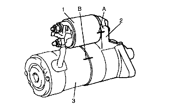 - Before disassembling starting motor, be sure to put match marks at 2 locations (A (magnetic clutch (1) and front housing (2)) and B (front housing (2) and yoke (3))) as shown in figure so that any possible mistake can be avoided.