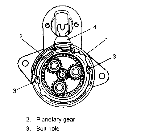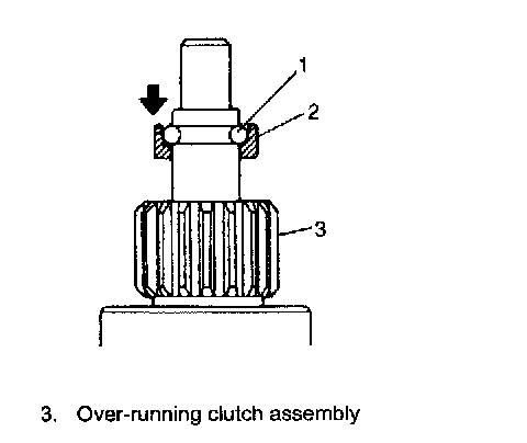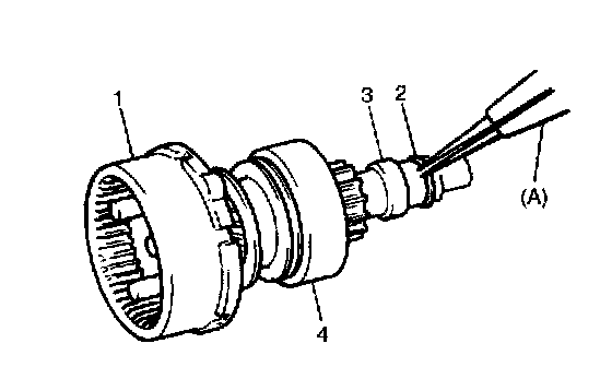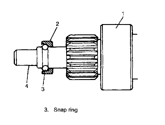 7. Remove snap ring (2) then pull out pinion stop ring (3) and over-running clutch (4) and internal gear (1).