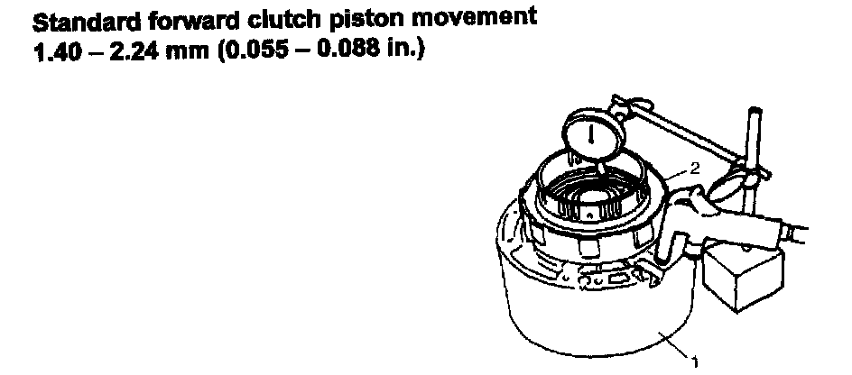 4) install forward clutch (2) to O/D case (1). Apply 4 - 8 kgf/cm2 air pressure into fluid hole at the right of cut in O/D case and measure movement of forward clutch piston. If measured value is not within standard range, use either 1.8 mm (0.071 inch) or 2.0 mm (0.079 inch) clutch disc to adjust it to standard value.