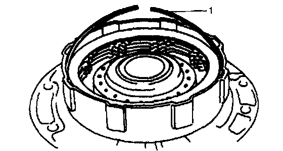 ^ Do not align opening in retaining ring (1) with lug of forward clutch piston return spring (2) at its retainer section.