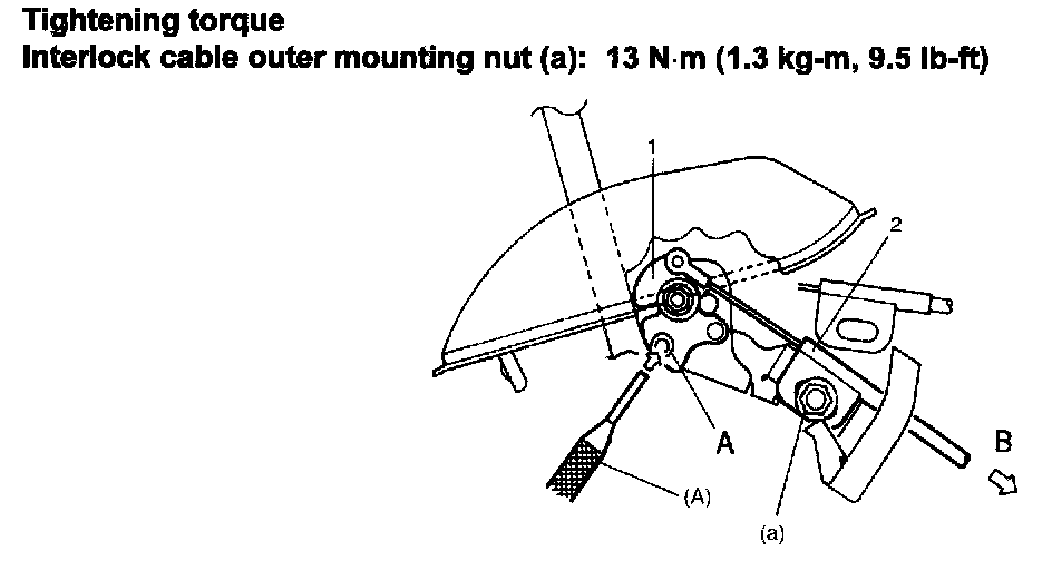 c) With key release cam (1) fixed with special tool, install cable outer (2) to bracket and after making sure that cable outer is pushed in arrow direction B by leaf spring, tighten mounting nut to specified torque. Remove special tool.