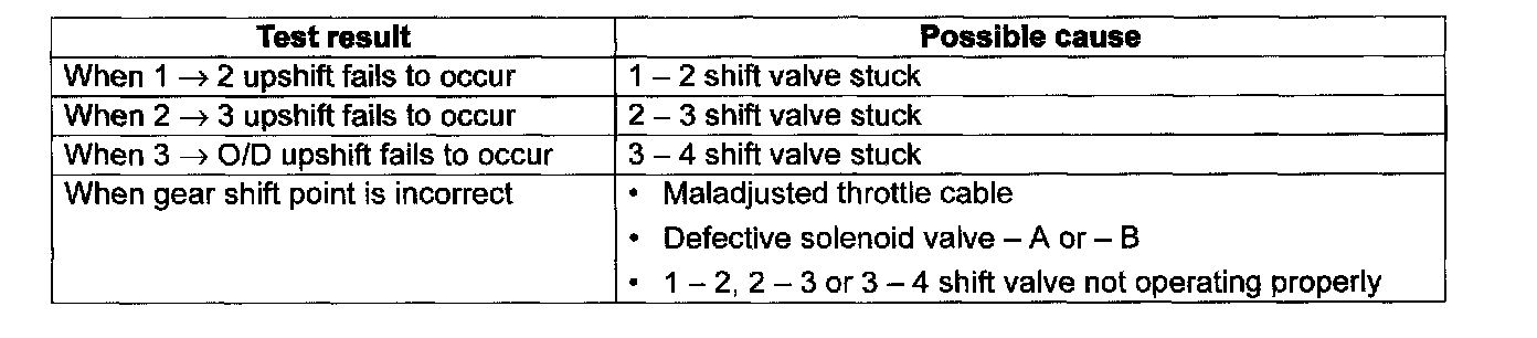 4) While driving in "D" range, check if gear shift occurs properly as shown in Gear Shift Diagram.