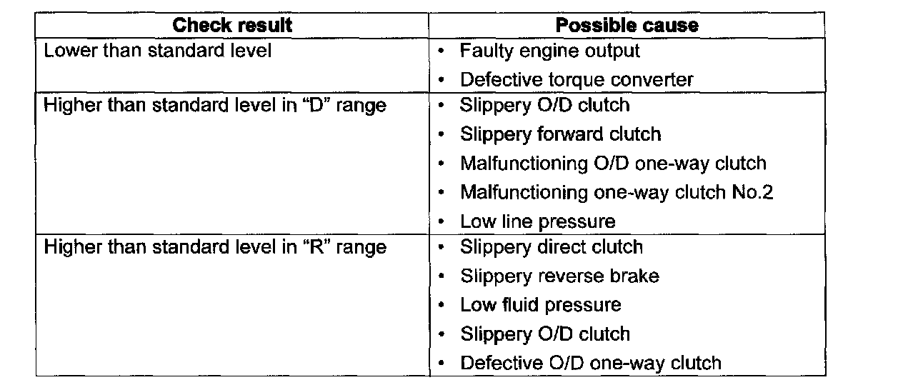 TestThis test is to check overall performance of automatic transmission and engine by measuring stall speed at "D" and "R" ranges. Be sure to perform this test only when transmission fluid is at normal operating temperature and its level is between FULL and LOW marks.