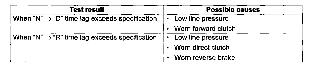 Time Lag TestThis test is to check conditions of clutch, reverse brake and fluid pressure. "Time lag" means time elapsed since select lever is shifted with engine idling till shock is felt.