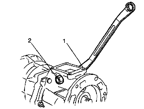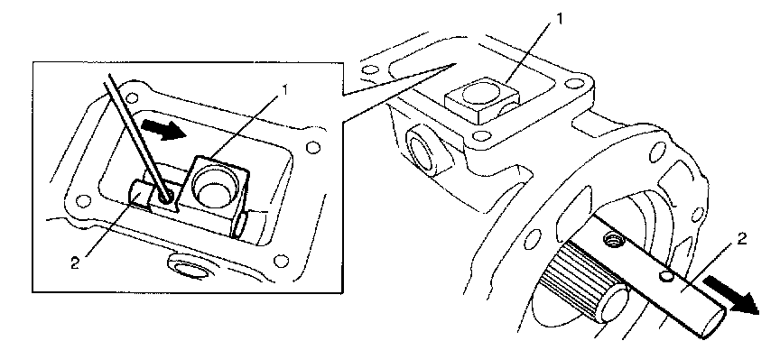 5) Remove gear shift shaft inner bolt (1) / plug (2).