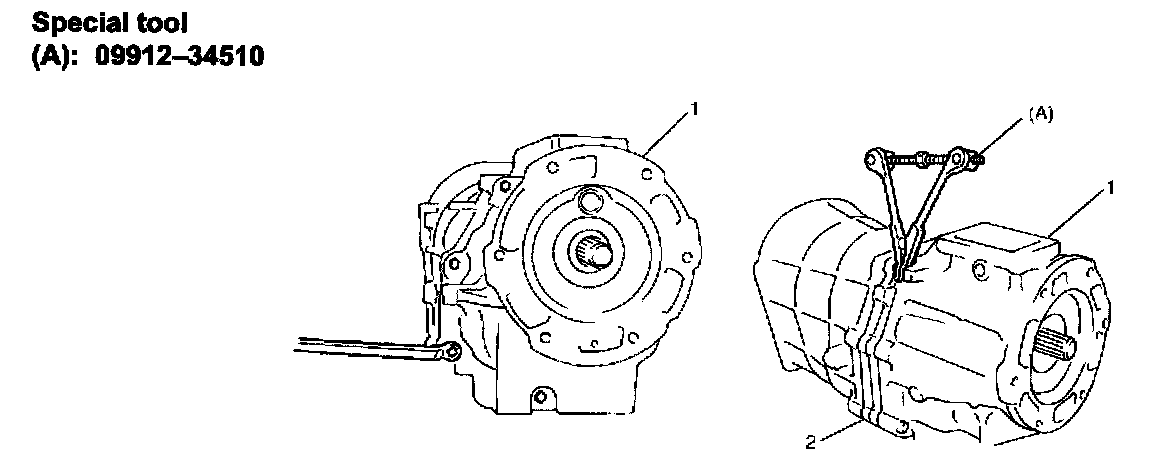 10) Using special tool (A), separate transmission front case (1) and transmission intermediate case (2).