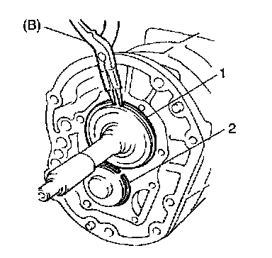 7) After removing transmission case bolts / nut, remove transmission rear case (1) from intermediate case (2).