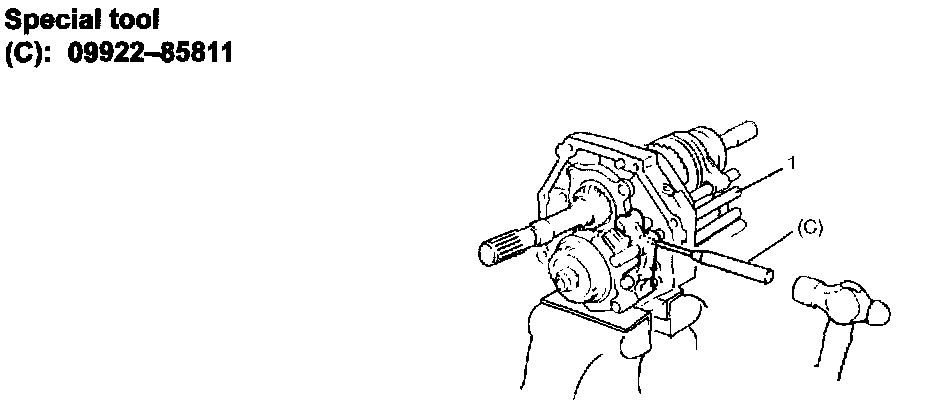 14) Using special tool (C), remove spring pin and then remove 5th-reverse gear shift shaft (1