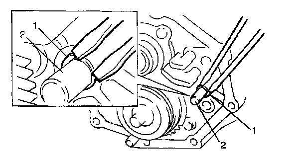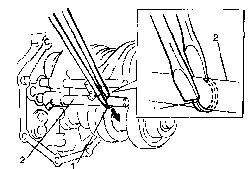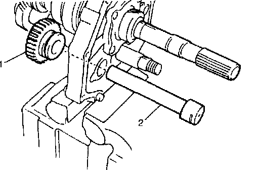 35) Remove reverse idle gear (1) and shaft (2).