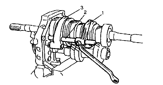 20) Remove reverse gear shift shaft (2), locating roller No. 1 (1), and reverse gear shift link component (3).