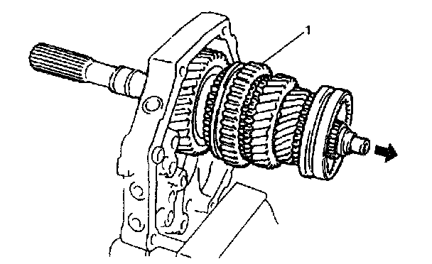 39) Remove input shaft assembly (1) with synchronizer ring from main shaft assembly (2).