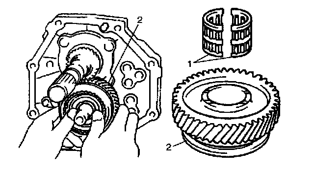 12) Install needle bearing (1), counter shaft 5th gear (2) and synchronizer ring.