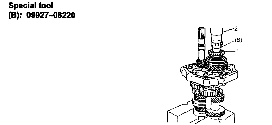 13) Press-fit 5th speed synchronizer dog (1) to countershaft with press (2) and special tool.