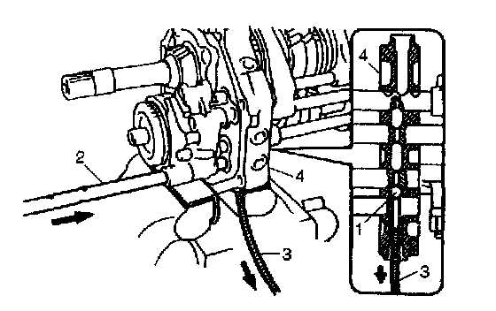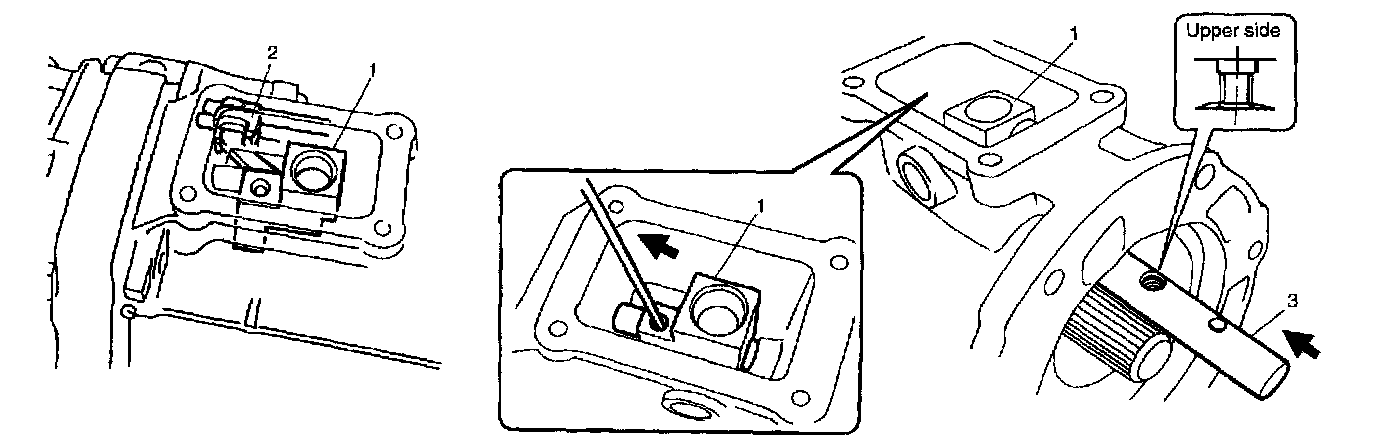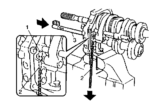 43) With tip end of gear shift shaft inner lever (1) hooked on head of gear shift shaft (2), insert gear shift inner shaft (3) into gear shift shaft inner lever.