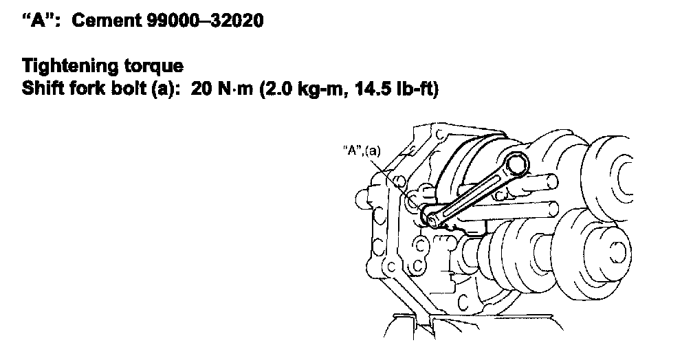 22) Apply thread lock cement "A" to thread of fork bolt and tighten bolt to specification.