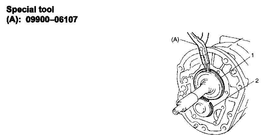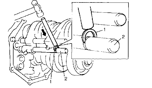 23) Fix with new circlip (1) to low gear shift shaft (2) by using lever or the like and hammer.