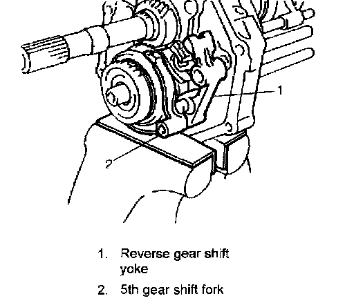 30) Install reverse gear shift yoke (1) and 5th gear shift fork (2) as shown in figure.