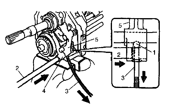 31) Supporting ball (1) with magnet (3) as shown in figure, insert 5th gear shift shaft (2) to 5th gear shift fork (4) and reverse gear shift yoke (5).