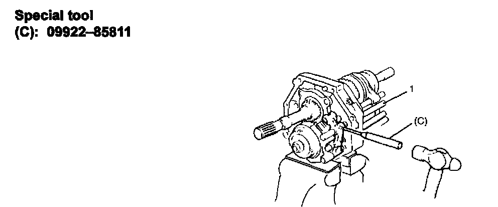 29) Drive pin into reverse gear shift link (1) and shaft by using special tool (C).