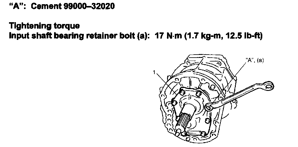 40) Apply cement "A" to input shaft bearing retainer bolt and install input shaft bearing retainer (1), new gasket and its bolts.
