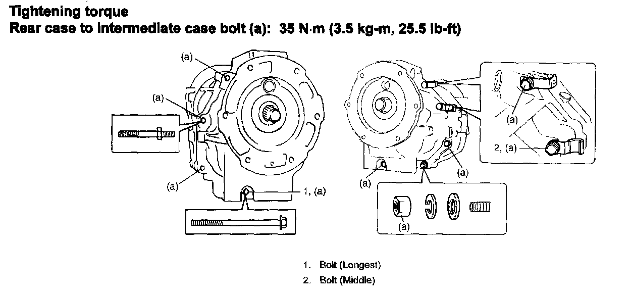 NOTE: When fitting of intermediate case (1) and bearing is tight, tap rear face of intermediate case (1) with plastic hammer lightly as It will cause main shaft assembly (2) to install.