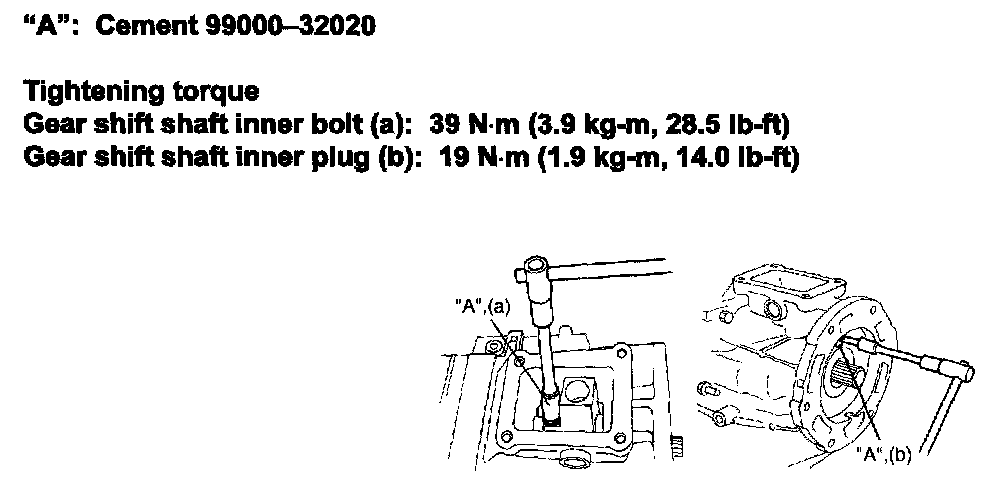 44) Apply cement "A" to inner gear shift shaft bolt / plug and tighten them to specification.