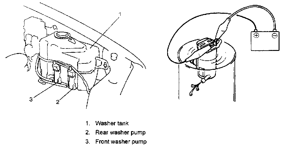 Washer Pump Inspection (Front and Rear)Connect battery (+) and (-) terminals to pump (+) and (-) terminals respectively to check pumping rate.