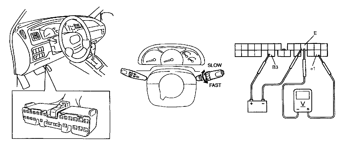 6. Connect voltmeter positive lead to terminal "+1" and negative lead to terminal "E". Check that the voltmeter indicates the battery voltage (10-14 V).