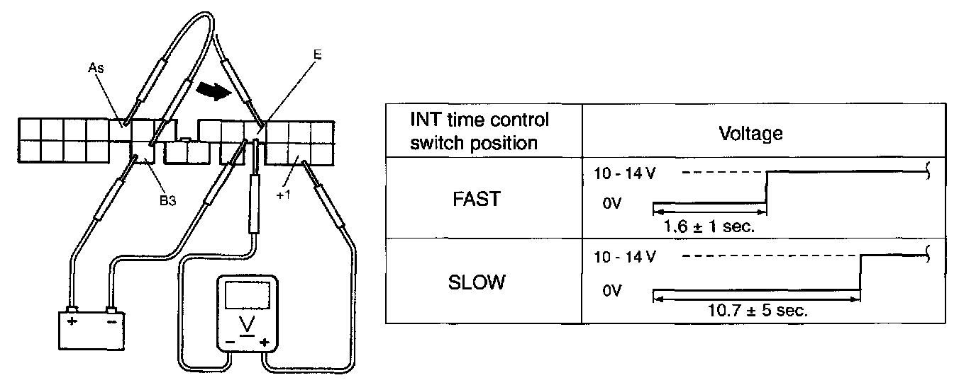 7. Connect terminal "As" and terminal "B3" by a jumper wire. Then connect terminal "B3" end to terminal "E". Observe the voltmeter voltage drops to 0 V right after connecting the jumper wire from terminal "B3" to "E". Then the voltage rises to battery voltage (10 - 14 V) within the time shown in the table.