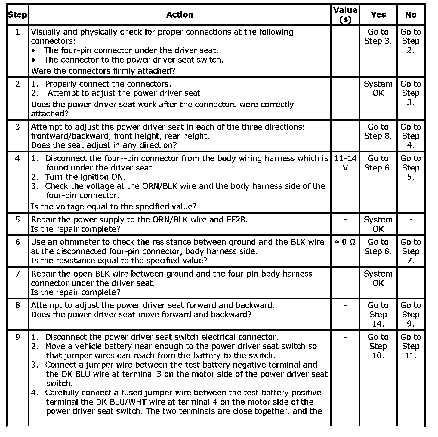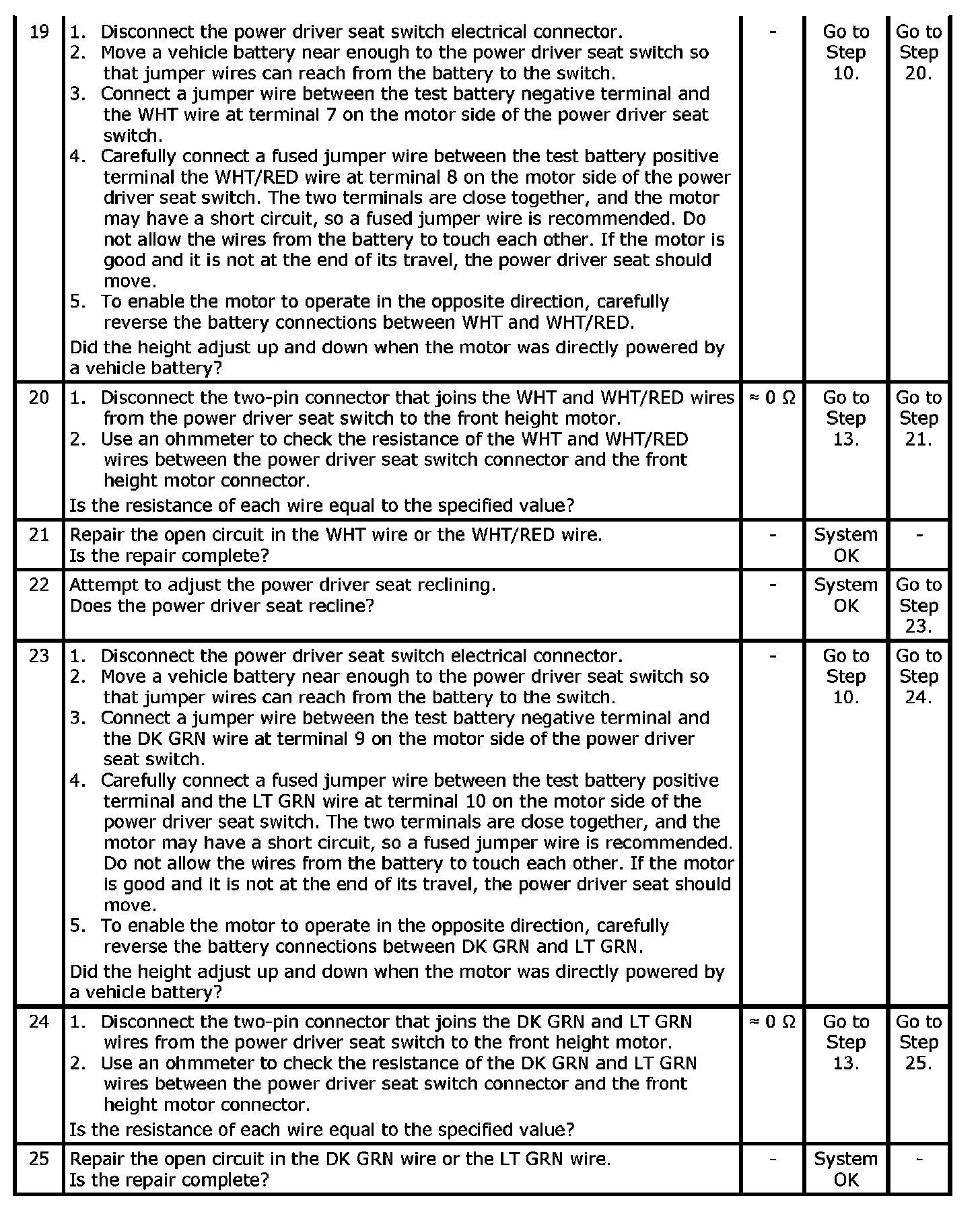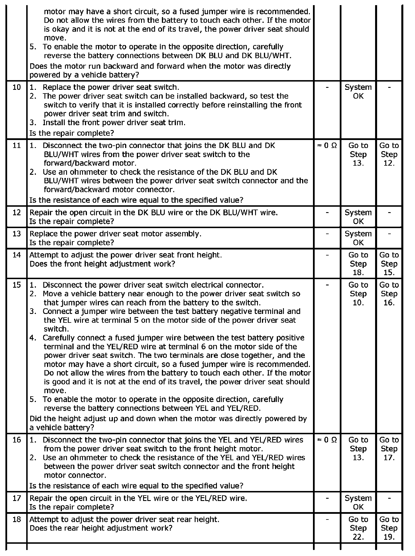 WARNING: If the driver seat motor is powered directly from a battery, personal injury could be caused by sparking and sudden heating of the terminals if the wires from the battery are touched together. Use a fused jumper wire, and use terminal test adapters if available. If terminal test adapters are not available, use insulating tape to reduce the possibility of touching the jumpers together.