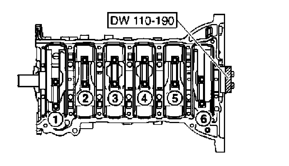 6. Install the piston using the piston ring compressor DW110-170-01 (2.0L) or DW110-170-02 (2.5L) Observe the installation order of the piston as follows: 2 - 5 - 1 - 6 - 3 - 4 (piston number).