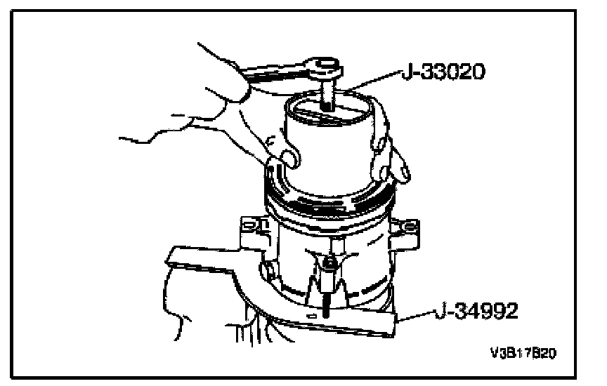 7. Position the puller crossbar J-8433-1 center forcing bolt on the puller pilot J-33023-A and assemble the two through-bolts and the washers through the slots on the puller crossbar J-8433-1. Thread the through-bolts into the holding fixture J-34992. The thread of the throughbolts should engage the full thickness of the fixture.