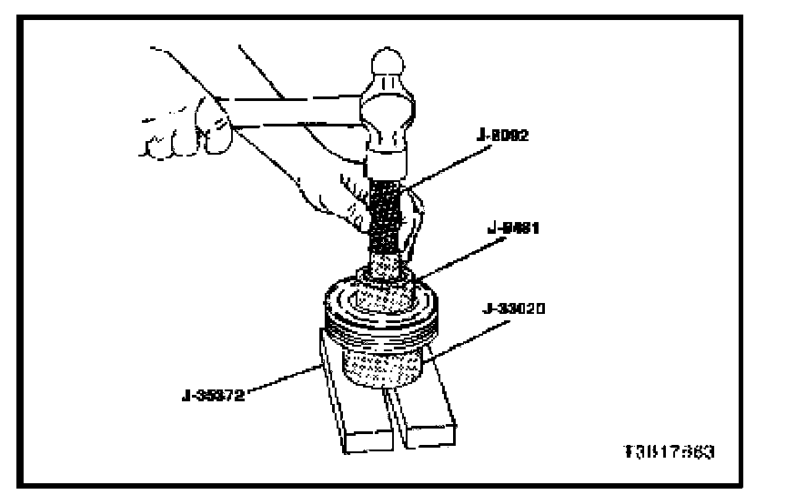 2. Align the new bearing squarely in the pulley bore. Use the bearing installer J-9481 and the driver handle J-8092, drive the bearing fully into the pulley bore.